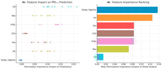 Panel A visualizes the features’ importance at their variation level in predicting PM2.5 levels. Each point shows the degree to which it contributes to the model. Thus, it is noted that carbon monoxide, NOx, FUEL, CO2, SOx, HC, and TOTAL TRAFFIC concentrations have different levels of influence. The TOTAL TRAFFIC feature shows the most negligible dispersion, in contrast to CO and NOx, which show the most considerable variability. Figure 9B shows the mean value importance of the features. TOTAL TRAFFIC emerges as the most critical factor influencing the prediction of PM2.5 levels, followed by the concentrations of HC, SOx, CO2, and FUEL pollutants. On the contrary, CO shows minor importance, which demonstrates that it is not a critical factor for the change in PM2.5 levels.