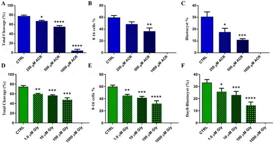 Effect of ACR and GLY on bovine embryo developmental competence. (A–C) Embryo cleavage and blastocyst development rates after exposure to varying concentrations of ACR (0, 250, 500, and 1000 µM). (D–F) Embryo cleavage and blastocyst development rates after exposure to varying concentrations of GLY (0, 1, 10, 100, and 1000 µM). The comparison between experimental groups versus the control was performed using Dunnett’s multiple comparison test. Statistical significances are presented as * (p < 0.05), ** (p < 0.01), *** (p < 0.001), and **** (p < 0.0001) and the values are shown as the mean values ± SEM.