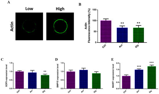 Based on the above-mentioned results, three groups corresponding to ACR treatment (500 µM), GLY treatment (10 µM), and an untreated control group were selected for the following investigations. As polar body extrusion and cytokinesis critically rely on the presence of actin filaments, the actin cytoskeleton in oocytes was analyzed following treatment with ACR and GLY using phalloidin-based staining. The results indicated a disruption in actin organization in both ACR- and GLY-treated oocytes, with a significant decrease in fluorescence intensity corresponding to actin cytoskeleton (F-actin; Figure 2A,B). The expression of genes related to oocyte maturation (GDF9, BMP15, and MARF1) was further analyzed following ACR and GLY treatments using RT-qPCR. Oocytes exposed to ACR and GLY showed a significant upregulation in the expression of MARF1 (Figure 2E). However, GLY-treated oocytes exhibited a significant decrease in GDF9 expression (Figure 2C).