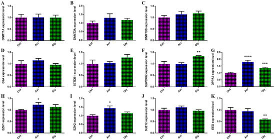 The expression of epigenetic regulation-related genes (DNMT1A, DNMT3A, DNMT3β, G9A, SETDB1, SUV39H2, DPPA3, EZH1, EZH2, SUZ12, and EED) was analyzed in oocytes following ACR and GLY treatments using RT-qPCR. Among the tested genes, the mRNA levels of DPPA3, EZH1, and EZH2 exhibited a significant increase in oocytes treated with ACR (Figure 3). In addition, GLY-treated oocytes displayed a significant increase in the expression of SUV39H2 and DPPA3 and a decrease in EED expression (Figure 3).