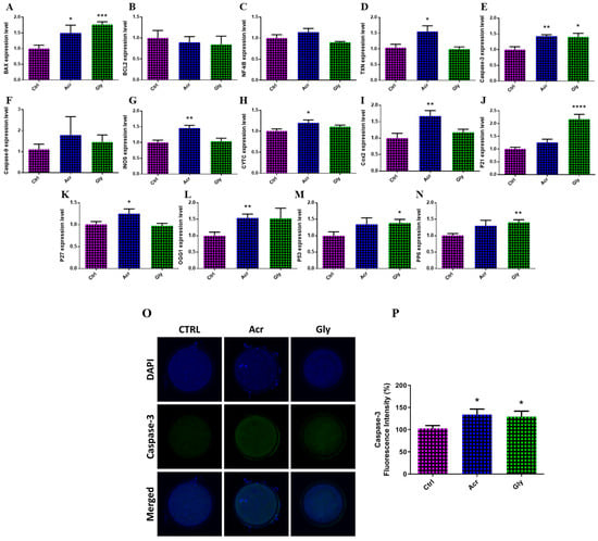 The DNA damage in oocytes was evaluated by analyzing the transcription pattern of the following genes: BAX, BCL2, NF-KB, TXN, caspase-3, caspase-9, iNOS, CYTC, COX2, P27, OGG1, P21, P53, and PP6. As shown in Figure 4, ACR-treated oocytes showed significantly higher expression levels of DNA damage-related markers, including BAX, TXN, caspase-3, iNOS, CYTC, COX2, P27, and OGG1, compared to control oocytes. Similarly, GLY-treated oocytes exhibited increased expression of BAX, caspase-3, P21, P53, and PP6 (Figure 4). Additionally, the levels of caspase-3, an apoptosis-related protein, were measured in oocytes exposed to ACR and GLY using immunofluorescence analysis. Oocytes exposed to ACR showed a significant increase in caspase-3 expression, suggesting higher levels of apoptosis (Figure 4O). Similarly, GLY treatment led to increased caspase-3 levels, though the increase was less pronounced compared to the ACR group (Figure 4O).