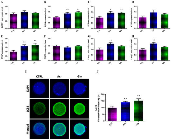 Autophagy induction in oocytes treated with ACR and GLY. (A–H) The relative expression of autophagy-related genes in oocytes treated with ACR and GLY using RT-qPCR. (I) Representative images displaying bovine oocytes stained with DAPI and LC3B. (J) LC3B protein levels measured by immunofluorescence. The comparison between ACR or GLY groups versus the control was performed using Student’s t-test. Statistical significance is presented as * (p < 0.05) and ** (p < 0.01), with values shown as mean ± SEM. Original magnification 100×.