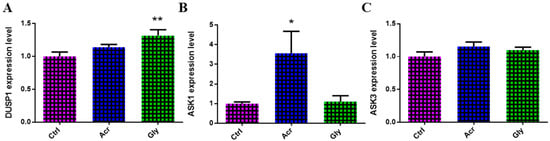 The expression of genes involved in the MAPK signaling pathway, which plays a critical role in cellular responses to stress, was analyzed in oocytes treated with ACR and GLY using RT-qPCR. As shown in Figure 6, ACR-treated oocytes exhibited a significant upregulation in ASK1 expression, while GLY treatment showed a significant increase in DUSP1 expression.