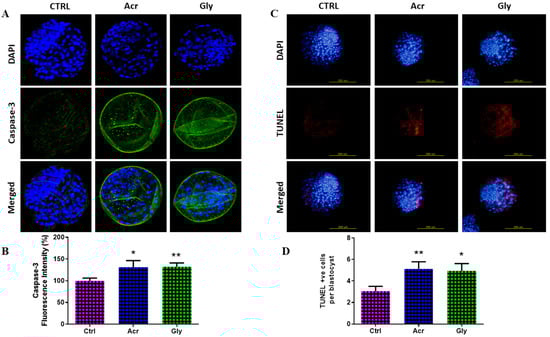 Quality of blastocysts following ACR and GLY exposure. Immunofluorescence of caspase-3 protein (A,B) and TUNEL staining (C,D) in blastocysts derived from ACR- and GLY-treated oocytes. The comparison between ACR or GLY groups versus the control was performed using Student’s t-test. Statistical significances are presented as * (p < 0.05) and ** (p < 0.01), with values shown as mean ± SEM. Original magnification 100× (A). Scale bar = 200 µm (C).