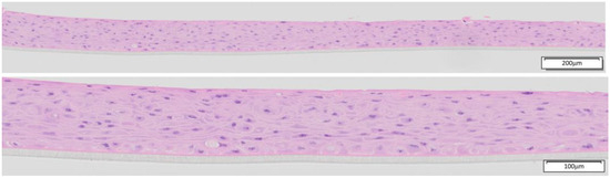 The EpiOral tissues (ORL-200) were produced by MatTek Corporation (Ashland, MA, USA) and MatTek Europe (Bratislava, Slovakia). The EpiOral tissues (ORL-200) consist of normal, human-derived oral epithelial cells. The cells have been cultured on specially prepared cell culture inserts (0.6 cm2 surface) in serum-free medium to form highly differentiated 3D models of the human buccal phenotype. The EpiOral tissue model exhibits non-cornified, in vivo-like morphological characteristics, which are uniform and highly reproducible (Figure 1).