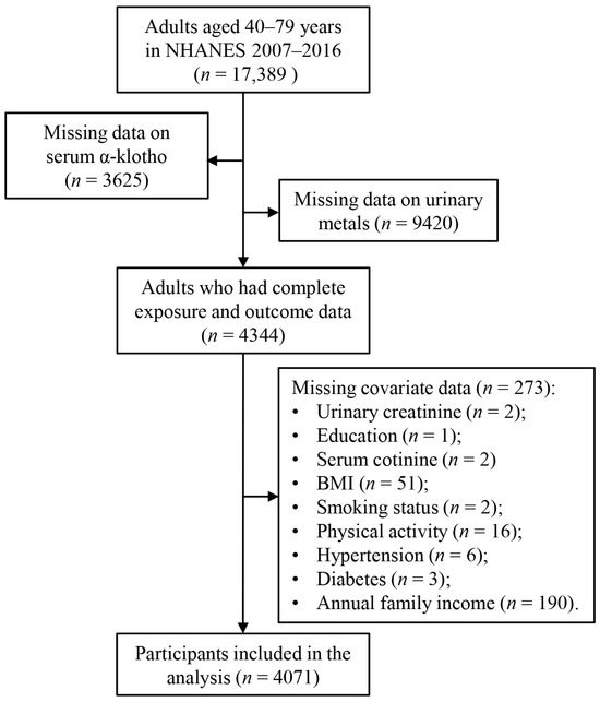 This study analyzed data from five cycles of the NHANES conducted between 2007 and 2016 (2007–2008, 2009–2010, 2011–2012, 2013–2014, 2015–2016). NHANES emphasizes environmental exposures and their impacts on health outcomes. Participants were selected based on the availability of data on urinary metals and serum α-Klotho levels, as shown in Figure 1. Initially, 17,389 adults aged 40–79 years were included in the analysis, as serum α-Klotho levels were only assessed in individuals within this age group. After excluding participants with incomplete data on serum α-Klotho (n = 3625), urinary metals (n = 9420), or covariates (n = 273), the final study population consisted of 4071 participants. The NHANES study protocol was reviewed and approved by the Institutional Review Board of the National Center for Health Statistics (NCHS), and informed consent was obtained from all participants. No additional ethical approval was required for this secondary data analysis.