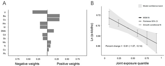To investigate the combined effects of multiple urinary metals on serum α-Klotho levels, the qgcomp model was employed (Figure 2). The regression index weights revealed that U, t-As, W, Cd, Sb, and Pb contributed negatively to serum α-Klotho levels, with U being the primary contributor to the overall negative association. In contrast, Ba, Cs, DMA, Mo, Tl, and Co showed positive associations with serum α-Klotho levels, with Ba having the greatest positive effect. Furthermore, the combined effect of the metal mixture was analyzed based on the quantile range (Figure 2B). The results demonstrated a negative correlation between the mixture of twelve urinary metals and serum α-Klotho levels. A linear decrease in serum α-Klotho levels was observed across increasing quartiles of the metal mixture, with a percent change of −0.61 (95% CI: −1.07, −0.14) (p = 0.002), suggesting that higher exposure to multiple metals is associated with reduced serum α-Klotho levels.