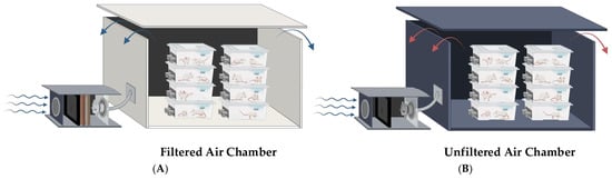 The exposure chambers consisted of two identical structures (2.1 m × 2.0 m × 2.1 m; Figure 1) positioned side by side, with air introduced at a constant flow rate of 20 m3/min. One chamber filtered the air using a three-stage system: metallic filters for large particles, HEPA PH97 filters that removed 99.97% of particles larger than 0.3 microns, and a Purafil PSA 102 gas filtration system with Purafil Select filter media (Purafil, Inc., Doraville, GA, USA). The other chamber received unfiltered air. Both chambers maintained consistent environmental conditions for temperature and humidity, which were regularly verified using calibrated sensors placed at strategic points within the structures. Air distribution was ensured to be uniform by a fan (150 m3/h) and a wide upper exhaust outlet.