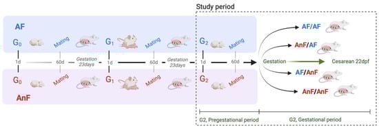 G2 rat breeding design. A diagram illustrating the breeding and developmental progression from the initial generation (G0) to the second generation (G2). It details the mating stages, gestation periods, and different environmental conditions (FA and NFA) to which the rats were exposed. The study period and methodological framework used to assess reproductive and developmental parameters in G2 rats are also included. FA = filtered air; NFA = non-filtered air (unfiltered air).