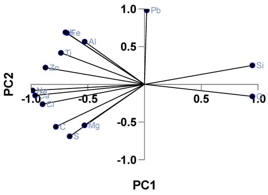 A principal component analysis (PCA) biplot with varimax rotation of the elemental composition of PM2.5. The biplot represents the distribution of elements in PM2.5 along the first two principal components (PC1 and PC2) after varimax rotation, which optimizes factor loadings for better interpretability. The direction and length of each vector indicate the strength and contribution of each element to the respective principal component. Elements such as Pb and Si exhibit strong positive loadings on PC1, suggesting that they originate from similar sources, possibly industrial emissions or geological materials. Conversely, Na, Cl, and Ca align along PC2, likely associated with sea-salt aerosols or soil-derived particles. Elements like Mg and S are more evenly distributed across both components, implying a contribution from mixed sources, such as biomass combustion and secondary aerosol formation. This analysis helps distinguish potential sources of particulate matter, supporting the identification of pollution origins relevant to exposure assessments in the study.