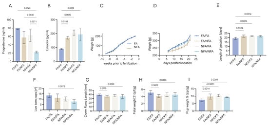 Significant differences were observed in the number of live G3 fetuses per litter across groups (Figure 4F). The crown–rump length (CRL) at 21 dpf was significantly greater in the FA/FA group (39.2 ± 2.11 mm) compared to the NFA/NFA group (35.2 ± 4.75 mm), reflecting a 12% increase (p < 0.0001; Figure 4G). Similarly, the fetal weight at 21 dpf was 13% higher in the FA/FA group (5.09 ± 0.59 g) compared to the NFA/NFA group (4.53 ± 0.59 g; p < 0.0001; Figure 4H). However, the post-natal fetal weight at 5 days was significantly lower in the FA/FA group (7.52 ± 1.26 g) compared to the NFA/NFA group (9.58 ± 0.47 g), representing a 22% reduction (p < 0.0001; Figure 4I).
