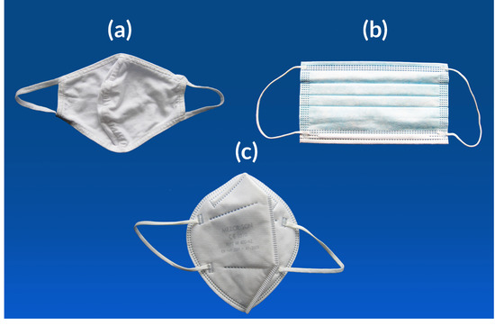 Before investigating the added value of “biocidal” metal (nano)particles, the composition of face masks and their efficiency as physical barriers that retain infectious droplets need to be reviewed. Various types of masks can be distinguished, each with different target users, filtration efficiency, and legal requirements. While definitions of “face masks” often exclude filtering facepiece respirators, they are included here, following several reviews and meta-analyses on their use during the COVID-19 pandemic [6,7,8,9,10,11,12,13,14,15,16]. Three main types can be distinguished (Figure 1).