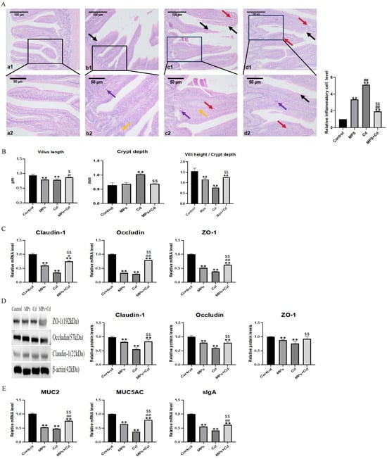 Regulatory effects of combined exposure of MPs and Cd on intestinal morphology and mucosal function of broilers. (A): HE staining results of broiler ileum tissue. (B): Effects of MPs and Cd on ileal morphology of broilers. (a1–d1): ileal structure in 100-fold visual field, (a2–d2): ileal structure in 200-fold visual field. (a1,a2): control group, (b1,b2): MPs group, (c1,c2): Cd group, (d1,d2): combined exposure group. Black arrow: fluff fracture. Red arrow: bleeding. Purple arrow: Inflammatory cell infiltration. Yellow arrow: vacuolization. (C): Effects of MPs and Cd on the mRNA of Claudin-1, Occludin and ZO-1 in broilers. (D): Effects of MPs and Cd on the relative content of Claudin-1, Occludin and ZO-1 protein (20 μL loading amount) in broilers. (E): Effects of MPs and Cd on the mRNA expression of MUC2, MUC5AC and sIgA. Values are expressed as AVG ± SD. **: compared with control group, # and ##: compared with MPs group, $ and $$: compared with Cd group. # and $ indicated significant difference in comparison (p < 0.05). **, ##, and $$ indicated that there was a very significant difference in comparison (p < 0.01).