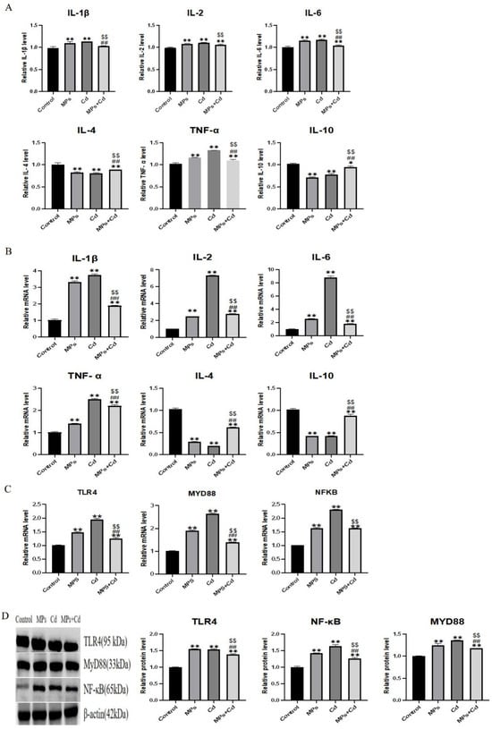 Effects of combined exposure of MPs and Cd on the regulation of intestinal inflammation in broilers. (A): Effects of MPs and Cd on the content of inflammatory factors in the ileum of broilers (10 μL loading amount of sample). (B): Effects of MPs and Cd on the relative mRNA content of ileum inflammation in broilers. (C): Effects of MPs and Cd on the relative mRNA content of the TLR4/MyD88/NF-κB inflammatory pathway in ileum of broilers. (D): Effects of MPs and Cd on key protein content of the TLR4/MyD88/NF-κB inflammatory pathway in ileum of broilers (20 μL loading amount). Values are expressed as AVG ± SD. * and **: compared with control group, ##: compared with MPs group, $$: compared with Cd group. * indicated significant difference in comparison (p < 0.05). **, ##, and $$ indicated that there was a very significant difference in comparison (p < 0.01).