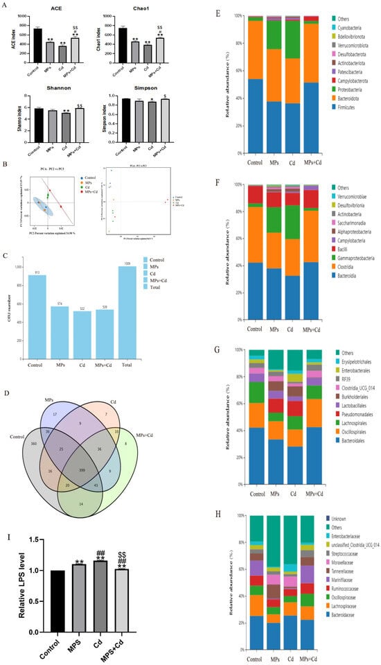 Regulation of cecal microbiota in broilers by combined exposure to MPs and Cd. (A): Alpha Diversity Index. (B): Analysis of the β diversity of the jejunal contents in broiler chickens. (C): Number of OTUs. (D): Venn diagram. (E): Analysis of OUT phylum levels in the cecal contents of broilers. (F): Analysis of OUT class levels of cecal contents in broilers. (G): Analysis of OUT order levels of cecal contents of broilers. (H): Analysis of OTU species levels of cecal contents of broilers. (I): Effects of MPs and Cd on the content of LPS in ileum of broilers (10 μL loading amount of sample). Values are expressed as AVG ± SD. * and **: compared with control group, # and ##: compared with MPs group, $ and $$: compared with Cd group. *, #, and $ indicated significant difference in comparison (p < 0.05). **, ##, and $$ indicated that there was a very significant difference in comparison (p < 0.01).