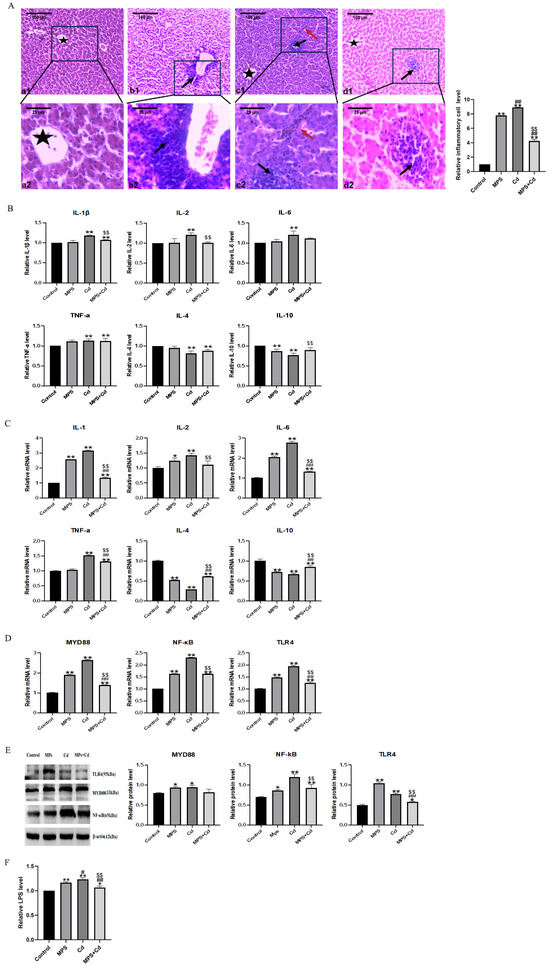 Regulation effect of combined exposure of MPs and Cd on liver inflammation in broilers. (A): HE staining results of broiler liver tissue. (a1–d1): Ileum structure in 100 times visual field, (a2–d2): Ileum structure in 400 times visual field. (a1,a2): control group, (b1,b2): MPs group, (c1,c2): Cd group, (d1,d2): combined exposure group. Black arrow: Inflammatory cell infiltration. Red arrow: bleeding. Five-pointed star: central vein. (B): Effects of MPs and Cd on the content of inflammatory factors in liver of broilers (10 μL loading amount of sample). (C): Effects of MPs and Cd on relative mRNA expression of liver inflammation in broilers. (D): Effects of MPs and Cd on mRNA content of the TLR4/MyD88/NF-κB inflammatory pathway in ileum of broilers. (E): Effects of MPs and Cd on the content of key proteins in the TLR4/MyD88/NF-κB inflammatory pathway in ileum of broilers (20 μL loading amount). (F): Effects of MPs and Cd on the content of LPS in liver of broilers (10 μL loading amount). Values are expressed as AVG ± SD. * and **: compared with control group, # and ##: compared with MPs group, $$: compared with Cd group. * and # indicated significant difference in comparison (p < 0.05). **, ## and $$ indicated that there was a very significant difference in comparison (p < 0.01).