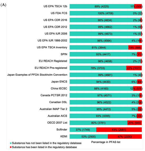 In addition, sources of PFAS jurisdictions in North America include the following: (i) US EPA TSCA 12b, which is the non-confidential portion of the US EPA’s Toxic Substances Control Act Chemical Substance Inventory for Chemicals subject to TSCA Section 12(b) Export Notification Requirements (https://www.epa.gov/tsca-import-export-requirements/chemicals-subject-tsca-section-12b-export-notification-requirements, accessed on 22 March 2025); (ii) the US FDA Inventory of Effective Food Contact Substances (FCS) (US FDA Inventory of Effective Food Contact Substance Notification (https://www.fda.gov/food/packaging-food-contact-substances-fcs/inventory-effective-food-contact-substance-fcs-notifications, accessed on 18 November 2024); effective premarket notifications for food contact substances that have been demonstrated to be safe for their intended use in the United States; the database is regularly updated and was last accessed by OECD [25] on 3 October 2017); (iii) the US EPA CDR (formerly IUR) database (US EPA Chemical Data Reporting (formerly Inventory Update Rule) Inventories (https://www.epa.gov/chemical-data-reporting, accessed on 22 March 2025); basic exposure-related information on the types, quantities, and uses of chemical substances produced domestically and imported into the United States when production volumes for the chemical are 25,000 pounds or greater at any single site for a specific reporting year (a reduced reporting threshold—2500 pounds—now applies to chemical substances subject to certain TSCA actions); data collected in 1986, 1990, 1994, 1998, 2002, 2006, 2012, and 2016) for the years 2012 and 2016; (iv) US EPA IUR 2006 (https://www.epa.gov/chemical-data-reporting/downloadable-2006-iur-public-database, accessed on 22 March 2025) and IUR (now CDR) 1986-2002 (previously downloaded from the US EPA website; the link is no longer provided), including primarily unregulated PFASs or those with minimal regulation; (v) the US EPA Toxic Substances Control Act (TSCA) Inventory (a list of each chemical substance that is manufactured or processed, including imports, in the United States for uses under the TSCA (https://www.epa.gov/tsca-inventory/how-access-tsca-inventory, accessed on 22 March 2025); regularly updated, and last updated in June 2017 (used in this study)); (vi) the Canadian Domestic Substances List (DSL) (Canadian Domestic Substances List (https://pollution-waste.canada.ca/substances-search/Substance?lang=en, accessed on 22 March 2025); includes substances manufactured in, imported into, or used in Canada on a commercial scale; regularly updated, and last accessed on 13 October 2017 for this study); and (vii) Canada PCTSR 2012 with a non-exhaustive list of Chemical Abstracts Service registry numbers for substances subject to the Prohibition Of Certain Toxic Substances Regulations, 2012; the list was kindly provided by the Government of Canada in November 2016. For Nordic countries, there is Substances in Preparations in Nordic Countries (SPIN) (http://spin2000.net, accessed on 22 March 2025; includes quantities, the industries in which the substances are used, and the function of chemicals that are used in Nordic countries based on data from the Product Registries of Norway, Sweden, Denmark, and Finland; regularly updated (last accessed on 29 November 2017 by the OECD [25])). In the European Union (EU), a majority of PFASs are unregulated, with a few regulated entries under EU REACH that are Pre-registered (used “fluoro” as the keyword based on the version corresponding to the last update on 10 May 2016; https://echa.europa.eu/information-on-chemicals/pre-registered-substances (accessed on 22 March 2025); the database is regularly updated and was last accessed by OECD [25] on 29 November 2017) and Registered (used “fluoro” as the keyword based on the version corresponding to the last update on 20 January 2017; https://echa.europa.eu/information-on-chemicals/registered-substances (accessed on 22 March 2025); the database is regularly updated and was last accessed by OECD [25] on 3 October 2017).