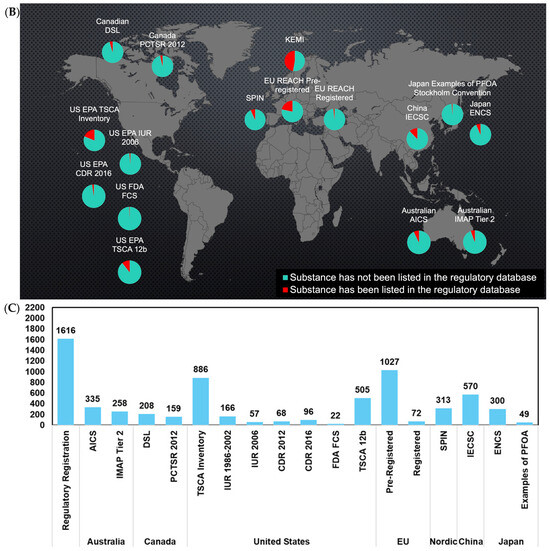 PFASs listed in different (A) regulatory databases, (B) databases corresponding to different geographic regions, and (C) PFASs with regulatory registration information in the SciFinder database.