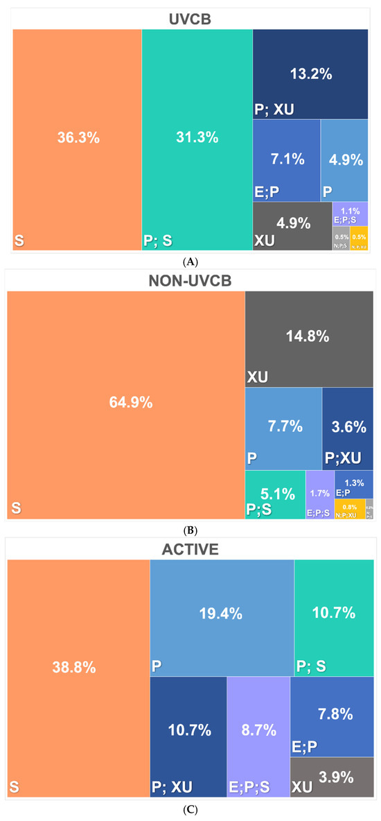 Figure 3 shows the PFAS regulatory categorization (referring to the categorization of PFASs by flagging them as UVCB or listing them as “active”) under the TSCA by the USEPA. The PFASs are classified based on their status as UVCB (Unknown or Variable composition, Complex reaction products, or Biological materials), non-UVCB, active, and non-active. The definition of active status is substances on the TSCA Inventory that can be manufactured, imported, or processed without any notifications. On the other hand, substances designated as “inactive” on the TSCA Inventory must be notified to the US EPA via a Notice of Activity Form (NOA-B) 90 days prior to manufacture, import, or processing. On receiving the notification form NOA-B, the EPA will change the designation of the notified chemical substance on the TSCA Inventory from inactive to active. Thus, the category in the TSCA database is of industry importance in the US region. Figure 3A illustrates PFASs under the UVCB category. The results showed that 36.3% of UVCB PFASs are classified as S (indicating a substance that is identified in a final Significant New Use Rule), 31.3% are classified as P;S (indicating a commenced Premanufacture Notice (PMN) substance (P) that is identified in a final Significant New Use Rule (S)), and 13.2% are classified as P;XU (indicating a commenced Premanufacture Notice (PMN) substance (P) that is exempt from reporting under the Chemical Date Reporting Rule (formerly the Inventory Update Reporting Rule), i.e., Partial Updating of the TSCA Inventory Data Base Production and Site Reports (40 CFR 711) (XU)). Smaller percentages fall into other categories such as E;P (7.1%; indicating a substance that is the subject of a Section 5(e) Consent Order under the TSCA (E) and a commenced Premanufacture Notice (PMN) (P)), P (4.9%; a commenced Premanufacture Notice (PMN) substance), XU (4.9%; indicating a substance exempt from reporting under the Chemical Date Reporting Rule (formerly the Inventory Update Reporting Rule), i.e., Partial Updating of the TSCA Inventory Data Base Production and Site Reports (40 CFR 711)), E;P;S (1.1%; indicating a substance that is the subject of a Section 5(e) Consent Order under the TSCA (E) and a commenced Premanufacture Notice (PMN) (P), and identified in a final Significant New Use Rule (S)), N;P;S (0.5%; indicating a polymeric substance that contains no free radical initiator in its inventory name but that is considered to cover the designated polymer made with any free radical initiator regardless of the amount used (N), is a commenced Premanufacture Notice (PMN) substance (P), and is identified in a final Significant New Use Rule (S)), and N;P;XU (0.1%; indicating a polymeric substance that contains no free radical initiator in its inventory name but that is considered to cover the designated polymer made with any free radical initiator regardless of the amount used (N), is a commenced Premanufacture Notice (PMN) substance (P), and is exempt from reporting under the Chemical Date Reporting Rule (formerly the Inventory Update Reporting Rule), i.e., Partial Updating of the TSCA Inventory Data Base Production and Site Reports (40 CFR 711) (XU)). For PFASs under category of non-UVCB, 64.9% are classified as S, followed by XU (14.8%), P (7.7%), P;S (5.1%), P;XU (3.6%), E;P;S (1.7%), E;P (1.3%), N;P;XU (0.8%), and N;P;S (0.2%) (Figure 3B).