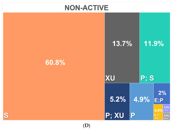 For active PFASs, 38.8% are classified as S, 19.4% as P, and 10.7% as P;S and P;XU. Smaller percentages are classified into other combinations such as E;P;S (8.7%), E;P (7.8%), and XU (3.9%) (Figure 3C). For non-active PFASs, 60.8% are classified as S, 13.7% as XU, and 11.9% as P;S. Smaller percentages are classified into other combinations of non-active properties including P;XU (5.2%), P (4.9%), E;P (2%), N;P;XU (0.8%), E;P;S (0.3%), and (0.3%) N;P;S. These subfigures collectively show the distribution and regulatory status of PFASs under the TSCA framework, highlighting the prevalence of certain PFAS categories within the regulatory environment (Figure 3D).