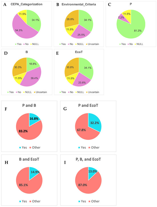 PFASs listed under different categories of (A) CEPA categorization and (B) environmental criteria and under (C) persistent (P), (D) bioaccumulative (B), (E) ecotoxic (EcoT), (F) P and B, (G) P and EcoT, (H) B and EcoT, and (I) P, B, and EcoT in the Canadian Domestic Substances List.