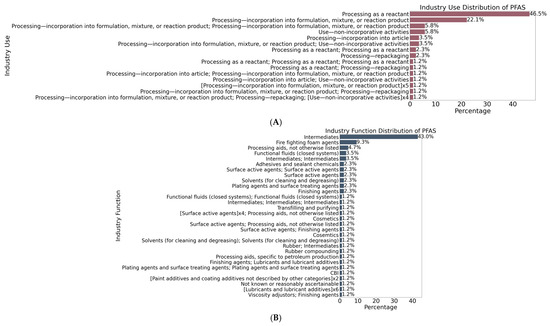 Figure 5 categorizes PFASs based on different industry-related parameters—industry use, industry function, and industry type—illustrating the prevalence and regulatory status of PFASs across various industrial applications. For PFAS application in various industrial processes, the majority of PFASs are used in processing as a reactant, accounting for 46.5% of the total usage, followed by PFASs used in processing—incorporation into formulation, mixture, or reaction product, which represents 22.1%. Other notable uses include withheld information (26.2%) and use—non-incorporative activities (5.8%) (Figure 5A). For the industry functions of PFASs, the largest category is intermediates, accounting for 43.0% of the total. Other significant functions include firefighting foam agents (9.3%), processing aids not otherwise listed (4.7%), and functional fluids in closed systems (3.5%). The distribution reveals that PFASs are predominantly used as intermediates, with other functions spanning a range of industrial applications including lubricants, sealants, and solvents (Figure 5B). For the distribution of PFASs across different industry types, the most significant category is “all other basic organic chemical manufacturing”, which comprises 25.6% of the total, followed by “plastic material and resin manufacturing” (17.4%) and “all other chemical product and preparation manufacturing” (14.0%). Other industry types include miscellaneous manufacturing, paper manufacturing, and textiles, apparel, and leather manufacturing. The figure highlights the diverse industrial sectors that utilize PFASs, with a heavy concentration in chemical manufacturing and resin production (Figure 5C).