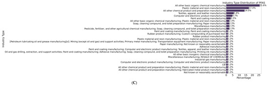 List of PFASs flagged with different (A) industry uses, (B) industry functions, and (C) industry types.