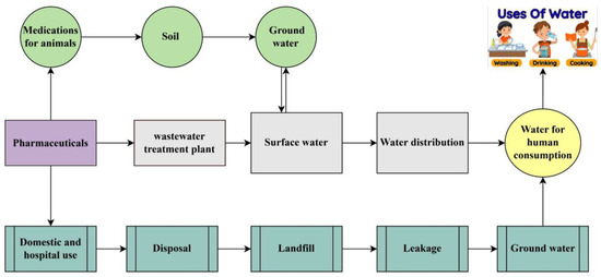 Water is the most common compound on earth, and it is essential for humans and other organisms, but the availability of clean water depends on the functioning of the world [1]. Water is a major contributor to domestic and industrial purposes; therefore, it is crucial to monitor the quality of surface and groundwater [2]. Currently, water bodies are being influenced by Emerging Contaminants (ECs), which have the capability to infiltrate ecosystems and are harmful for the environment as well as humans [3,4]. Pharmaceutical contaminants (PCs) are one of the major categories of ECs that can be used to prevent human disease. They are a biologically active compounds that arise form pharmaceutical industries used for medication or disease treatment [5,6]. Personal care products (PPCPs) are mostly used to ensure better quality of life, which includes all cosmetics products and many other useful items that are utilized in our daily lives [7]. PPCPs and pharmaceuticals, both considered important sources for increasing PC in the environment, have adverse impacts on aquatic ecosystems and human health. Some pharmaceuticals can disrupt reproductive cycles in women and men by acting as endocrine disruptors. Estrogen hormone decreases gonadotropin output, leading to an atrophic effect on adult female ovaries. Several pharmaceutical pollutants increase cancer risk due to genotoxic effects observed in aquatic organisms [8]. However, the pathways leading to PC are depicted in Figure 1. Mostly, when these products are used and then disposed of, they can enter wastewater systems and finally reach water bodies. Many PPCPs are not completely removed during wastewater treatment, but there are some methods used to reduce the high environmental risk [9]. The continuous release of PCs into water bodies can lead to long-term, chronic effects on both animals and aquatic plants, disrupting their health and ecosystems over time. Antibiotic medications like ciprofloxacin and sulfamethoxazole are frequently detected, with concentrations that contribute to expansion of antibiotic-resistant bacteria [10]. Antidepressants like fluoxetine (Prozac) were detected in aquatic environments; they can have harmful effects on biodiversity specially on fish [11]. Pharmaceutical residue concentrations in the environment vary and are mostly influenced by human activity, production waste, and wastewater method capabilities [12]. However, bisphenol A (BPA) and bisphenol S (BPS) are also major environmental concerns because of their harmful effects on human health and their estrogenic and genotoxic effects [13,14]. Both BPA (C15 H12 O2) and BPS (HOC6H4)2 SO2 originated from personal care products (PPCPs); they are more commonly associated with polycarbonate plastics and used as a primary raw material for the production of beverages, food cans, water bottles, and flame retardants [15,16]. Wastewater treatment confirms that PPCPs are an important source in aquatic environments because of the partial deduction of PPCPs during the treatment process. Wastewater treatment has become of greater significance due to the growing concern about xenobiotics in water resources and how to eliminate them from water [17].