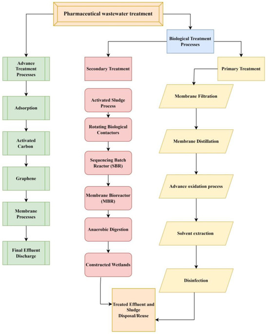There are various ways and strategies present to treat pharmaceutical wastewater contamination including physical, chemical, and biological methods. The wastewater purification process consists of five main steps such as preliminary treatment (physical and mechanical processes), primary treatment (chemical and physical–chemical processes), secondary treatment (biological and chemical processes), and tertiary or advanced treatment (physical and chemical processes). However, the current study discusses biological and advanced techniques to treat the contamination of wastewater (Figure 3) [73]. Decomposition of ECs into tiny molecules or even to water and CO2 using biomineralization employing microorganisms like algae, fungi, and bacteria leads, through microbial metabolism, to the degradation of nutrients like nitrogen and phosphorus as well as organic matter [74]. Biological treatment includes solvent extraction, improved oxidation procedures, membrane distillation, biological membrane filtration, and disinfection. Further, biological treatment methods are commonly divided into aerobic processes, anaerobic processes, and combinations of anaerobic–aerobic processes [75]. Several advanced anaerobic strategies, including the anaerobic membrane bioreactor (AnMBR), the UASB, the anaerobic sequencing batch reactor (AnSBR), the moving bed biofilm reactor (MBBR), and other hybrid technologies, have demonstrated their effectiveness in pharmaceutical treatment [76]. Because wastewaters have a high organic content, the anaerobic method—which requires fewer nutrients and little space—seems to be an efficient, economical, and effective way to break down medications [77]. The membrane bioreactors and anaerobic treatment plant batch reactors are the key technology of treatment plants [78]. Research is being conducted on biological treatment for plants, which creates renewable energy in methane, and it is an environmentally friendly treatment. Furthermore, the feasibility of using anaerobic digestion and sulfamethoxazole pharmaceutical wastewater treatment is limited; research has explored the possibility, but it these types of treatments remain largely uninvestigated [79,80].