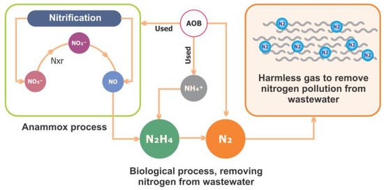 Various cost-effective techniques exist to prevent the release of PPCPs into the ecosystem. Certain PPCPs pose a challenge for microorganisms to break down, as pharmaceuticals were originally designed to be toxic. Some potential bacterial species have the abilities to reduce and degrade pharmaceutical pollutants, changing their complex structure into a less toxic or nontoxic form [18]. Anammox is a biological process conducted by autotrophic bacteria, also known as “anammox bacteria”, which removes N compounds from the wastewater and converts ammonium (NH4+) into nitrite (NO2−). This process is involved in N-cycle reactions; for example, nitrite accepts electrons and reacts with ammonium to make molecular N in anaerobic conditions [19].