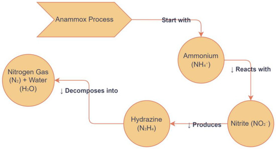 Anammox bacteria have been discovered in six genera, such as Anammoxoglobus, Anammoximicrobium brocadia Jettenia, and Kuenenia, which originated in activated sludge, and Scalindua, commonly found in marine environments in oxygen zones [144]. Candidatus’ holds a unique position because it does not exist in pure culture and requires cultivation in an artificial environment, specifically a laboratory. Understanding the role of these bacteria and their function is critical for the key biological mechanisms of anammox reactions shown in Figure 5. The reactions with two intermediates (hydrazine and NO) and three key enzymes, such as hydrazine synthase (HZS), hydrazine dehydrogenase (HDH), and nitrite oxidoreductase reductase (NIR), were found to be responsible for the anammox metabolism [145].
