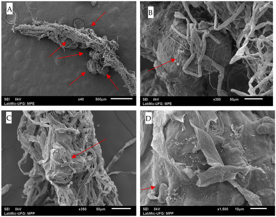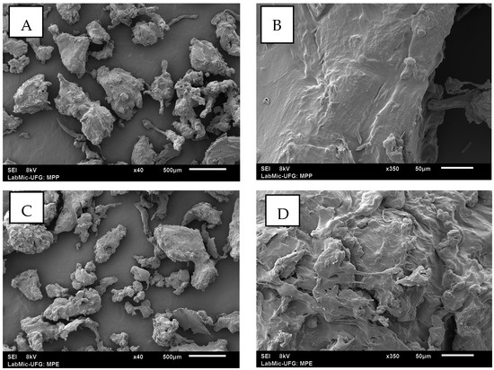 SEM revealed significant structural changes in AMPs (Figure 1A,B). While the PMPs exhibited smooth and homogeneous surfaces (Figure 1C,D), the AMPs displayed roughness, cracks, and surface cavities, characteristics indicative of structural degradation.