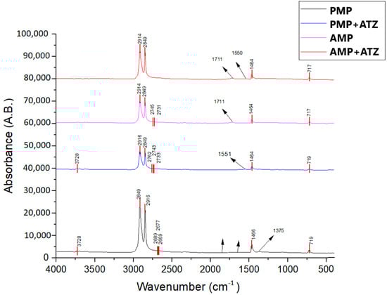 FTIR was employed to assess the changes in the functional groups of MP particles before and after ATZ adsorption, as well as the structural modifications in the MPs due to aging (Figure 2). The spectral peaks observed for the PE MPs were attributed to -CH₂- stretching at 2915 cm⁻1 and 2848 cm⁻1, -CH₂- bending at 1464 cm⁻1, and -(CH₂)n- rocking at 719 cm⁻1. After adsorption, spectral peaks were identified at 3254 cm⁻1 (-NH stretching) and 1550 cm⁻1 (thiotriazine stretching), which are characteristic of ATZ but appeared with low intensity, suggesting that the interaction between this compound and both PMPs and AMPs was primarily physical [15]. Aging of polyethylene MPs due to UV radiation exposure for 120 days resulted in significant chemical changes on their surfaces, as observed through the Fourier transform infrared (FTIR) spectroscopy analyses. These alterations are primarily evident in the spectral regions corresponding to the surface oxygenated groups, such as hydroxyl groups (3600–3000 cm⁻1), carbonyls (1800–1400 cm⁻1), and esters and vinyl groups (1400–800 cm⁻1), as reported in previous studies [41,42].