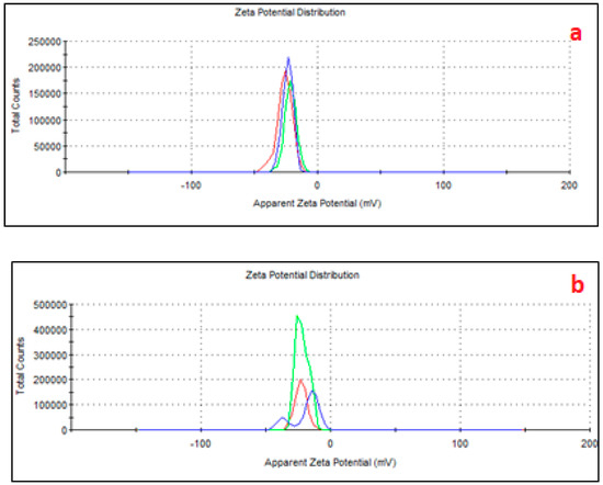 Zeta potential of AMPs (a) and PMPs (b), with adsorbed ATZ. The line colors refer to three replicates of the same sample.