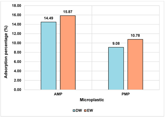 As shown in Figure 4, MPs in the enriched medium exhibited higher adsorption values for AMPs and PMPs. This phenomenon may be related to the presence of ions, which influence the adsorption process through mechanisms such as electrostatic shielding, salting-out effects, and extrusion. The presence of NaCl, for example, tends to induce a salting-out effect on the adsorption of hydrophobic chemical compounds [50], which may have influenced the results observed in this study, given the presence of this salt in the enriched solutions.
