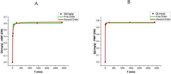 For the pseudo-first-order model, the qe values for PMPs were 0.427 mg/g in DW and 0.566 mg/g in EW. In contrast, for AMPs, these values increased to 0.505 mg/g and 0.603 mg/g, respectively. The determination coefficients (R2) for this model ranged from 0.968 to 0.9985, indicating a good fit of the experimental data to the model under both conditions.