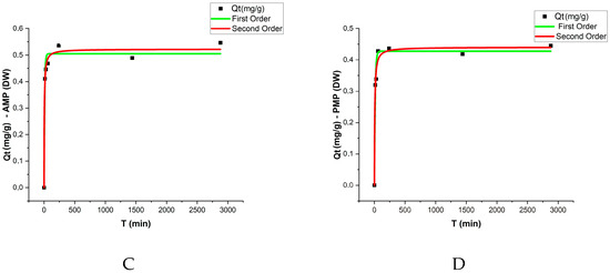 The adsorption kinetic results were evaluated using pseudo-first-order and pseudo-second-order models, with the respective parameters presented in Table 2 and Figure 5. The analysis revealed that equilibrium was reached after approximately 48 h, with a sharp increase in adsorption rates during the initial stages of the experiment. The qe values (adsorption capacity at equilibrium) varied among treatments, with AMPs exhibiting slightly higher adsorption capacities compared to PMPs in both matrices (DW and EW).