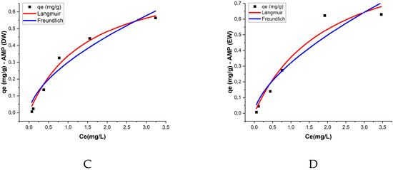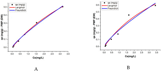 In PMPs in DW, the maximum adsorption capacity (qm) was 1.612 mg/g, while the Langmuir constant (KL) was 0.145 L/mg, reflecting a moderate affinity between ATZ and the PMP surfaces. For AMPs in DW, the maximum adsorption capacity decreased to 0.841 mg/g, but the KL constant significantly increased to 0.671 L/mg, indicating that despite the reduction in total adsorption capacity, the affinity between AMPs and ATZ was higher. In EW, PMPs exhibited a qm of 1.493 mg/g and a KL of 0.204 L/mg, while AMPs had a lower qm of 1.076 mg/g but a higher KL of 0.495 L/mg.