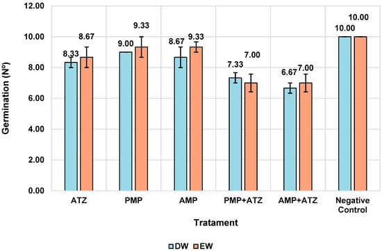 Phytotoxicity assays were conducted using Lactuca sativa seeds to evaluate the impact of MPs and ATZ on germination and root growth processes. Four treatment types were tested as follows: a negative control consisting of DW and EW without MPs or ATZ; a positive control with 0.05 mol/L of zinc sulfate (ZnSO₄) solution [36,37,38], used as a reference for known toxicity to validate the test sensitivity; treatments with isolated MPs, where seeds were exposed to MPs in distilled or enriched water without ATZ; and treatments with MPs containing adsorbed ATZ (MP+ATZ), in which seeds were exposed to MPs pre-treated with ATZ in both aquatic matrices.