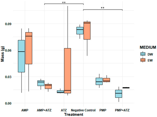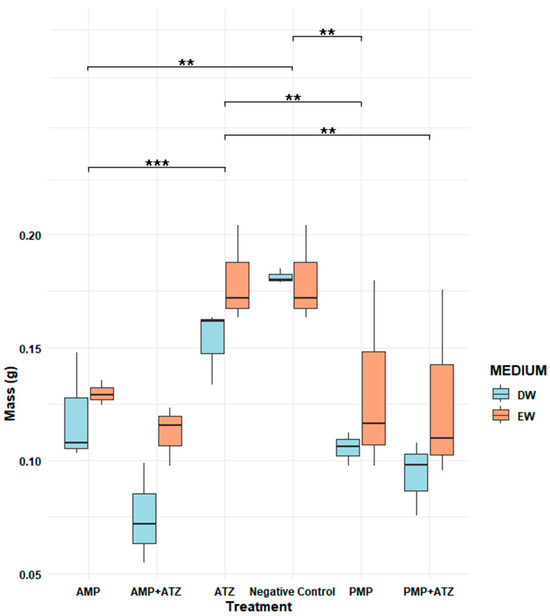 During the desorption stage, ATZ molecules were not detected in the desorbed water from MPs with ATZ, indicating that the remaining fraction of ATZ remained strongly adsorbed onto the MPs’ surfaces, particularly in AMPs, and was not released under the experimental conditions. These findings suggest that ATZ sorbed onto MPs was resistant to the desorption processes applied. Consequently, phytotoxicity tests were conducted in the presence of MP particles with adsorbed ATZ.
