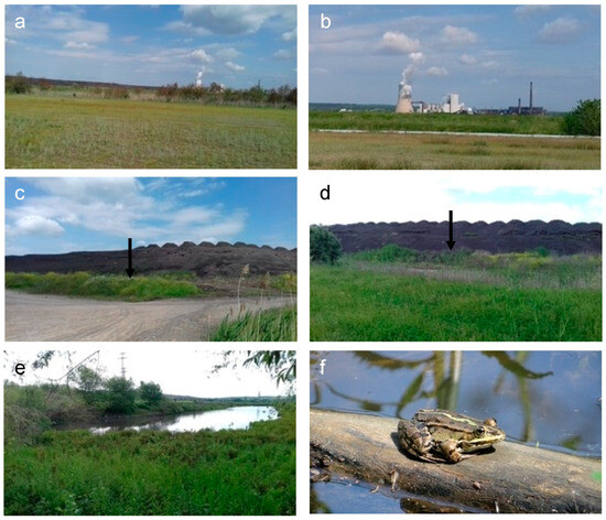 (a) General view of the sedimentation lake; (b) TPP AES “Galabovo” and TPP “Brikel”; (c,d) heaps of industrial ash; (e) a temporary body of water within the area of the sedimentation lake; (f) a male individual of Pelophylax ridibundus. Places where frogs were captured (arrows, e).
