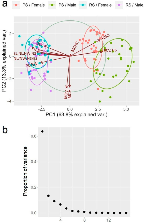 (a) A diagram of the correlations of erythrogram and erythrocyte-metric parameters in the Pelophylax ridibundus individuals from the investigated sites with the first two main axes. The distinguishing force of the parameter is indicated by the arrow length; a large importance is shown by the long arrow and it is strongly correlated with the ordination axes. (b) A scree plot of the proportion of variance explained by each principal component.
