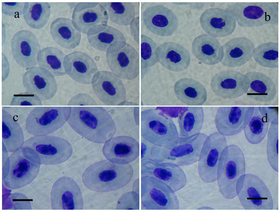 Photomicrographs of erythrocytes of Pelophylax ridibundus individuals from the polluted site, (a,b) the sedimentation lake of Brikel TPP, and the reference site, (c,d) Vacha River in southern Bulgaria. Scale lines = 10 μm.
