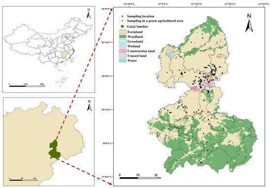 The study area is located in Yingtan City, Jiangxi Province, China. It is characterized by a subtropical, humid monsoon climate; the region experiences high temperatures, ample sunlight, and abundant rainfall. The predominant soil type is Ferralsols (based on the FAO Soil Classification System), and the primary crop cultivated is rice. Yingtan City is endowed with abundant mineral resources, with reserves of Pb, Zn, Ag, and Mn ranking among the top in Jiangxi Province. The Guixi Smelter, the largest modern copper smelter in China, is located in the research area. Its main products include copper, sulfuric acid, electrolytic copper, electrolytic silver, etc. In 2022, a total of 148 agricultural soil samples (depth of 0–20 cm) were collected using clean stainless-steel shovels (Delixi Electric Co., Ltd., Leqing, China), each comprising a mixture of five closely located subsamples. After applying the quartering method, approximately 1 kg of the mixed soil sample was retained and stored in a polyethylene bag away from light, and the sampling information was recorded. The sampling sites are shown in Figure 1.