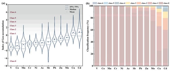 To further investigate the degree of PTE pollution in agricultural soils, the Index of Geo-accumulation was applied. The regional Igeo mean is ranked from lowest to highest (Figure 2a), listed as V < Co < Mn < Cr < Ni < As < Sb < Pb < Zn < Mo < Cu < Cd. The pollution status of Cu and Cd in the soil is particularly concerning, with their respective Igeo mean values of 0.73 and 0.84, both falling within the class 1 zone (Table 1), which is a scope of moderate contamination. In contrast, all other PTEs fall in the zone of class 0, with no pollution. As far as how PTEs in soil fall into the scope of contamination is concerned, the Igeo indicates that Cu, Cd, Mo, and Sb are 74.32%, 70.95%, 25.00%, and 11.49%, respectively, whereas Mn, Ni, As, Pb, and Zn are below 10%. No contamination of V, Co, or Cr is found (Figure 2b). After calculating the Igeo value, it emphasizes the necessity to pay more attention to the risk that Cu and Cd may pose.