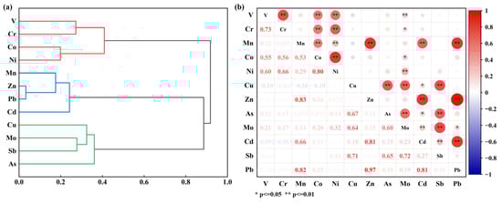 Homology analysis of potentially toxic elements in soil. (a,b) R-type cluster map and Spearman correlation heat map, respectively.