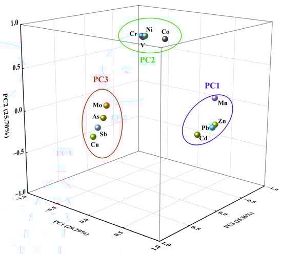 PCA is further utilized to delineate the sources of PTEs in the soil. The Kaiser–Meyer–Olkin test gave a value of 0.76, a value suitable for factor analysis, and the Bartlett sphericity examination passed. Following varimax rotation to maximize variance, three principal components were identified, adhering to the criterion of eigenvalues exceeding 1 in PCA. These components cumulatively account for 80.34% of the total variance, suggesting that the majority of PTE sources can be attributed to these three principal components. The three factors after rotation are shown (Table 3), and the loadings on each factor are displayed (Figure 4).