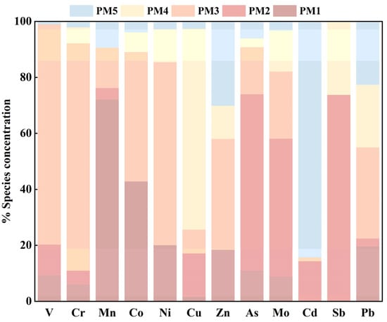 PM5 has a relatively high contribution of 84.37% to Cd. It was often regarded as a hallmark element in agricultural activities [,]. In general, some research found that phosphate ores contain 5–100 mg/kg of Cd, and most or all of the Cd enters the fertilizer []. Excessive application of phosphate fertilizer can cause the accumulation of Cd in the soil. Hence, PM5 is considered an agricultural source.