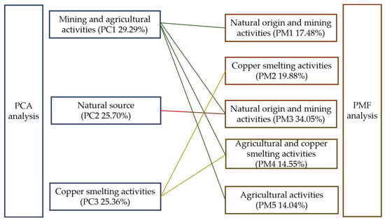 PM4 was mainly characterized by loadings from Cu. In this study, over 80% of the survey sites showed Cu concentrations exceeding the background value, with an average exceedance multiple of 3.76, which indicates that Cu has been related to severe external input. The copper smelting activities mentioned may have a role in contributing to Cu in soil. As far as other input ways, it cannot be ignored that Cu, as an inherent component of additives in livestock feed, will be transferred to the soil via animal manure []. In addition, using fertilizers and pesticides can lead to the accumulation of Cu in the soil []. So, PM4 is set as a mixed source of agriculture and copper smelting.