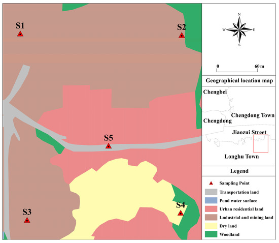 Based on preliminary and detailed investigations, monitoring points were planned to be set up in areas within the site that may be heavily polluted. Due to the use of a large amount of strong acidic materials in the production process, the tanks, valves, and other items of machinery are severely corroded, and the conveying pipelines and anti-corrosion lining are aging. Owing to leakage and seepage during the original production process, pollutants may have spread throughout the site, posing a significant threat to the safety of the soil, the groundwater, and the surrounding natural water environment. Due to years of outdated production activities, the soil at the site is polluted to varying degrees. The commonly used point sampling method is the five-point sampling method. First, the midpoint of the diagonal (in a square or rectangular sampling area, the diagonal refers to the straight line connecting the two diagonal vertices of the sampling area) was determined as the center sampling point, and then four points on the diagonal equidistant from the center sampling point were selected as sampling points. For S1–S5, we followed the five-point sampling method, where two samples of the same sample at each point are analyzed synchronously under identical conditions using the three-point sampling method. The soils at the rare and precious metal site were sampled from five plots, each with an area of 300 m2, representing soils with different concentrations of PTEs.